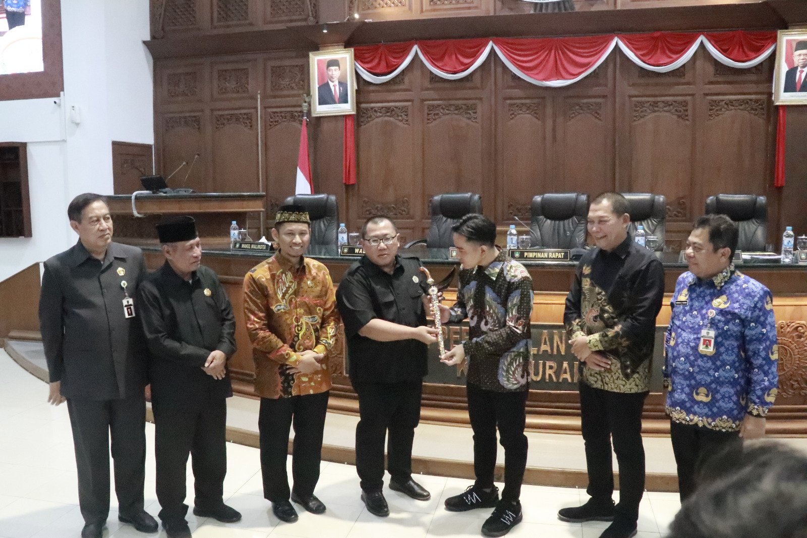 Wali Kota Surakarta, Gibran Rakabuming Raka juga terlihat duduk dikursi podium disamping Ketua DPRD dengan didamping Wakil Wali Kota Surakarta, Teguh Prakosa.