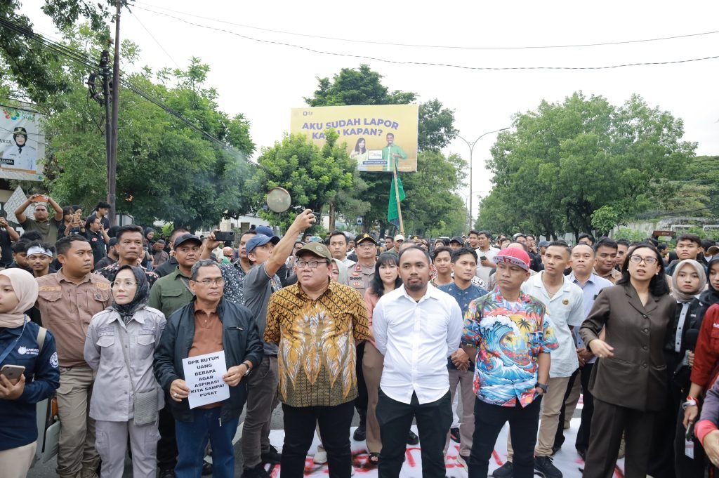 Ketua DPRD Kota Surakarta, Budi Prasetyo dan Wakil Ketua, Muhammad Bilal, didampingi sejumlah legislator lintas fraksi, menemui massa yang berkerumun di tengah Jl. Adi Sucipto. Ia menjelaskan bahwa pihaknya telah berupaya menindaklanjuti tuntutan yang disampaikan sebelumnya pada 20 Februari 2025.